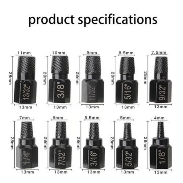 A 10 darabos csavarkiszedő készlet átfogó méretválasztékot kínál, így minden kiszedési feladathoz megtalálja a megfelelő szerszámot.