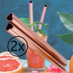 Két rózsaarany szív alakú fémszívószál.