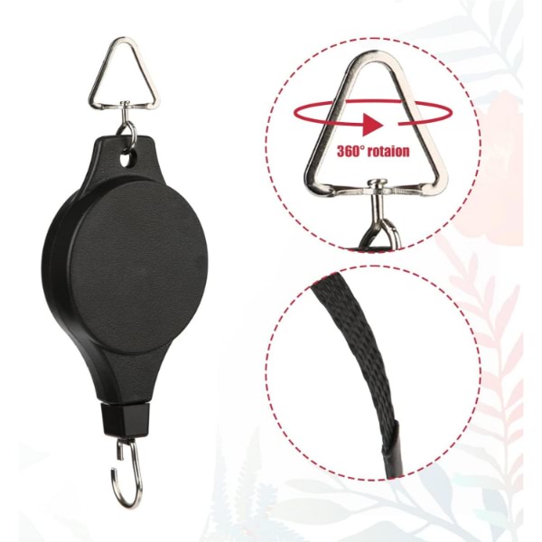 Robusztus műanyagból készült, tartós nejlonzsinórral és 360°-ban forgó kampóval a többirányú használathoz.