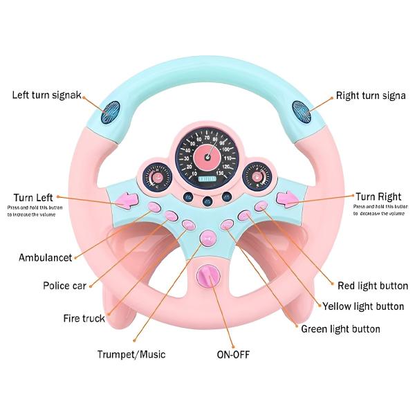 A szórakoztató hangokkal, villogó fényekkel és könnyen megnyomható gombokkal kialakított kormánykerék magával ragadja a fiatal vezetőket, és fantáziadús játékba vonja őket.