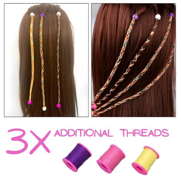 - A csomag tartalma: 1x hajfonógép, 12x hajcsipesz, 3x cérna (sárga, rózsaszín és lila cérna), 2x fonal a könnyebb használatért.