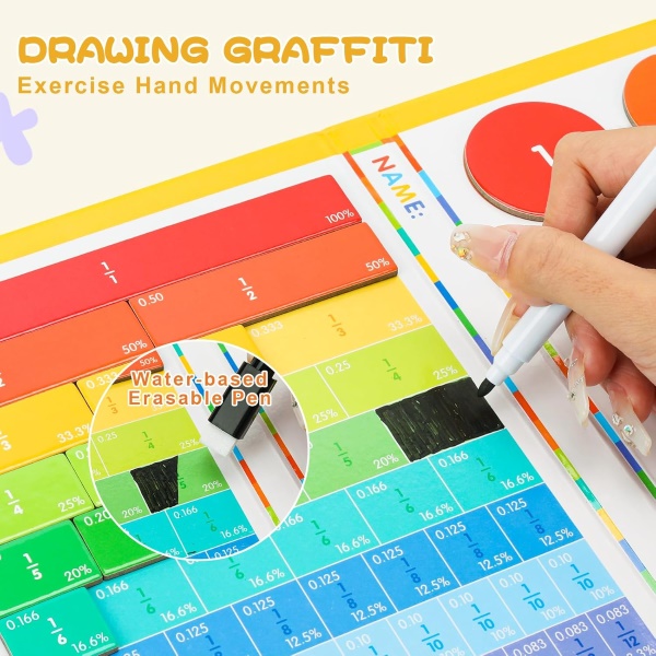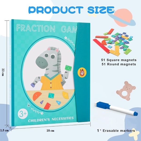 9 színes mágneses kört és téglalapot tartalmaz, amelyek megkönnyítik a törtek szemléltetését és megértését.