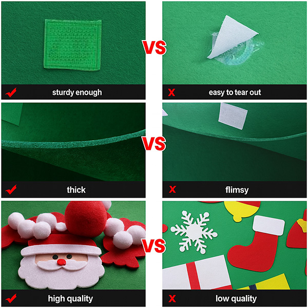 Ugyanabból a nehéz, kiváló minőségű filcből készültek. Varrt tépőzárral rögzíthetők (ellentétben az olcsóbb ragasztottakkal). Példák: csengők, ajándékok, hóember, cukorka és hópelyhek. A fának van csillag a tetejére és törzs az aljára. A tépőzár a fára van varrva, hogy stabilan tartsa mindkét részt.