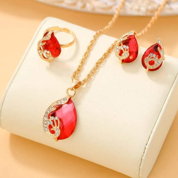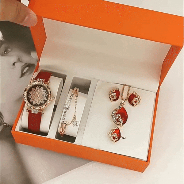 Az elegáns piros kiegészítőkből álló készlet egy női órát, karkötőt, fülbevalót, gyűrűt és nyakláncot tartalmaz, minőségi anyagokból. 🎁